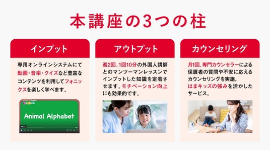 - 専門家×浜学園グループの強力な相乗効果 「浜学園・はまキッズ」が長年培ってきた幼児教育ノウハウと、専門家による子育て・英語学習のアドバイスを親子で同時に享受できる、これまでにない本格的な学習環境をご提供します。