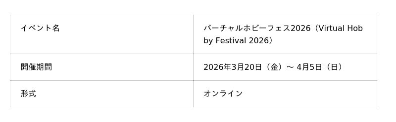 デジタルギア株式会社(所在地:東京都港区海岸3丁目18-21 2F、代表取締役:漆崎 祥一)は、2026年3月20日(金)より株式会社ホビージャパンと株式会社Vが共同開催するオンラインイベント「バーチャルホビーフェス2026(Virtual Hobby Festival 2026)」において、複数コンテンツの3Dモデル制作を担当したことをお知らせいたします。