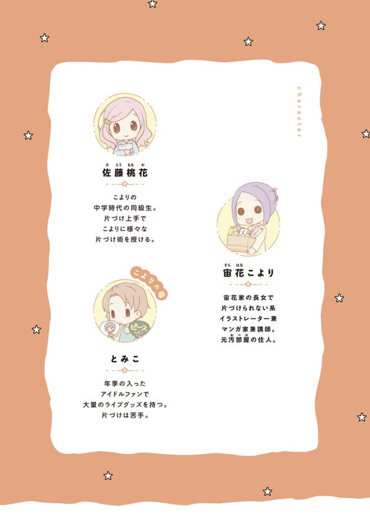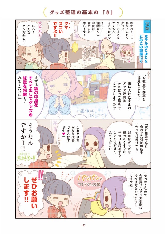 本作の著者であり、元汚部屋住人の漫画家・宙花こよりが、自身の体験をもとに「推し活グッズ」特有の収納術をレクチャーします。アクスタ、フィギュア、大量のぬいぐるみ、ブロマイド……。増え続けるアイテムを「普段使い用」「次のライブ用」「鑑賞・保存用」の3種類に仕分けることで、荷物の総量を可視化し、スッキリ収納する方法をマンガでわかりやすく解説します。■ライブ参戦の必需品からマニアックな悩みまで、徹底カバー!