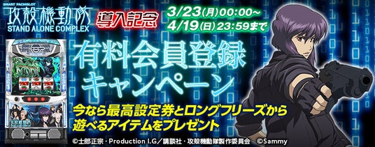 上記期間中に有料会員登録をしていただいた方を対象に、「スマスロ 攻殻機動隊」のロングフリーズから遊べるアイテムと最高設定券をもれなくプレゼント!