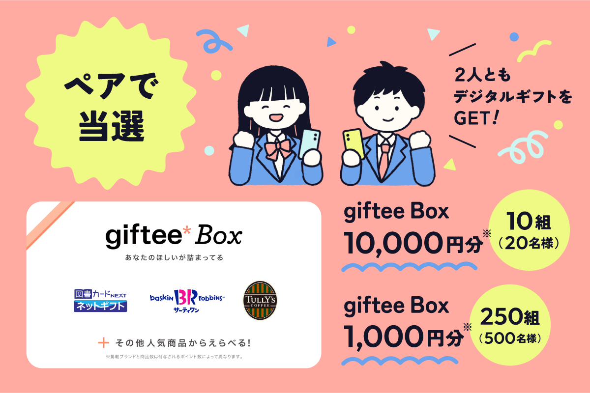 ※「giftee Box(R)」は、株式会社ギフティが提供するデジタルギフトであり、様々なラインナップの中から贈呈された「ギフトポイント」内でお好きな商品と交換することができます。「giftee Box(R)」および「ギフトポイント」の利用には会員登録やアプリダウンロードの必要もなく、保有ポイント内で複数のギフトを選ぶことも可能です。