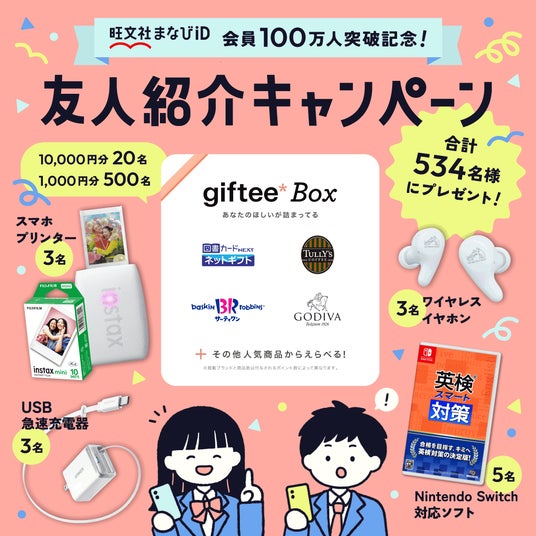 プレゼントは260組(520名様)にデジタルギフト「giftee Box(R)」、さらに14名様にスマホプリンタやワイヤレスイヤホンなどの豪華賞品が抽選で当たります。