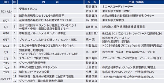 (受講者所属先の例)旭化成株式会社、味の素株式会社、AGC株式会社、株式会社NTTドコモ、キヤノン株式会社、株式会社神戸製鋼所、株式会社資生堂、JFEエンジニアリング株式会社、ソニー株式会社、大日本印刷株式会社、東レ株式会社、株式会社ニチレイフーズ、日産自動車株式会社、日本電気株式会社、日本電信電話株式会社、株式会社日立製作所、株式会社ブリヂストン、三菱電機株式会社、国立研究開発法人科学技術振興機構、国土交通省、特許庁、などの他、近年はスタートアップの経営者・知財担当者も多く参加、これまで200名以上の社会人方が受講