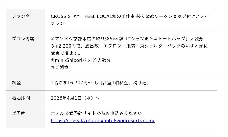 地元の伝統の手仕事を、見て、触れて、自ら作る体験ができる「CROSS STAY - FEEL LOCAL絞り染めワークショップ付き宿泊プラン」に、「東袋コース」と「東ショルダーバッグコース」を追加し、4月1日(水)から販売を開始します。東袋は、表生地と内生地の素材の違いにより染め上がりの濃淡が変わるため、リバーシブルでもお使いいただけます。自分だけの一品を作り、思い出とともにお持ち帰りください。