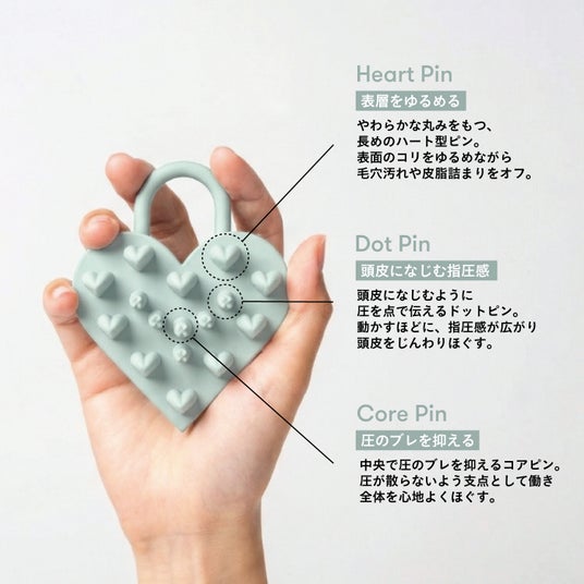 頭皮にフィットする3種のピンを採用。ハートピンがしなるように頭皮を掴み、3種類の特殊なピンで押すことで心地よいスッキリとしたマッサージが叶います。