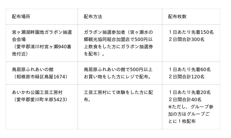 宮ヶ瀬湖畔園地・宮ヶ瀬水の郷プロムナード等で開催される第19回宮ヶ瀬桜まつりにおいて、ガラポン抽選会が行われる令和8年4月11日(土曜日)、12日(日曜日)に宮ヶ瀬湖周辺地域でロゴのステッカーを配布します。場所等詳細は以下のとおりです。