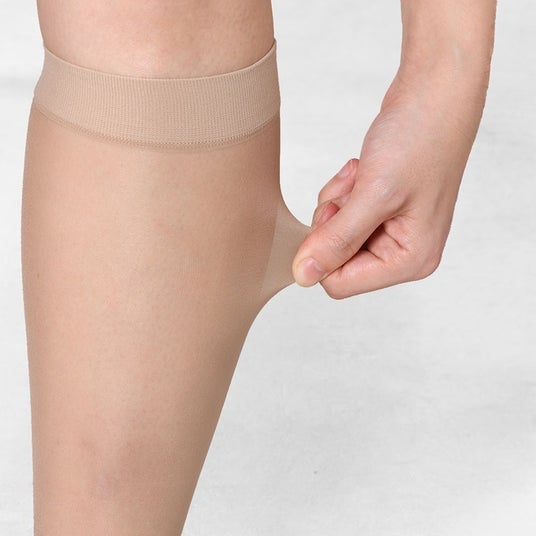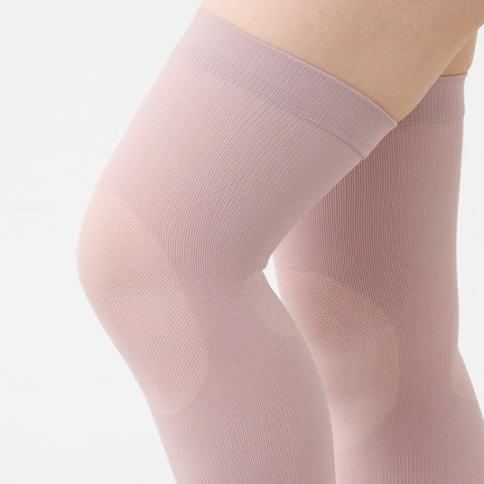 引き締めすぎによる寝苦しさや圧迫感を感じさせない優しいはき心地、脱ぎ履きしやすく快適なナイロン製の着圧オーバーニーです。