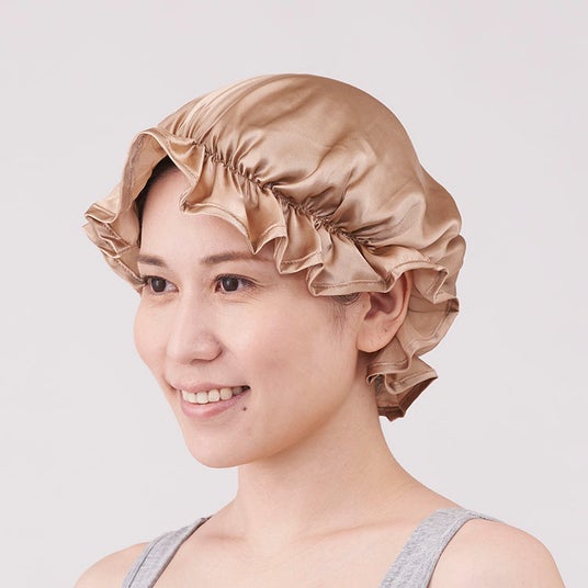 保湿性・吸湿性に優れた絹100%のサテン生地が、髪をさらりと包み込み、就寝中の摩擦や乾燥から守ります。全周に柔らかなゴムを採用しているため、締め付け感のない優しいつけ心地が続きます。
