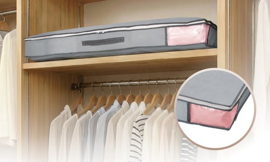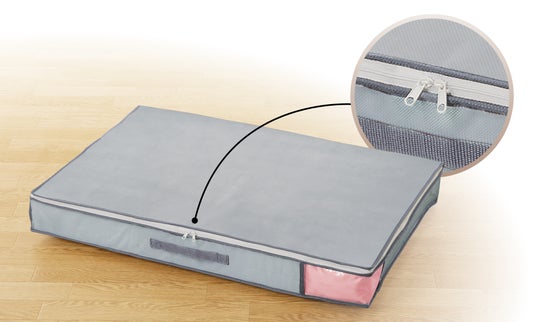 中身が見えるクリアな窓付き!収納後は、高さ約10cmのコンパクトサイズに!押入れやクローゼット上段に置いても、何を入れたか一目で分かる!