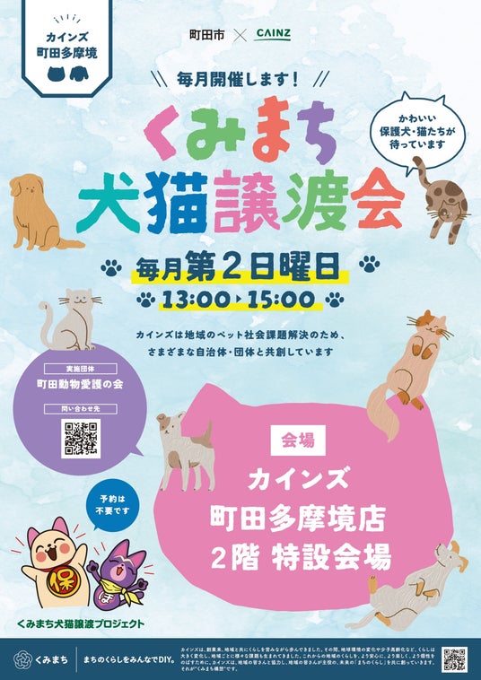 この度、株式会社カインズが取り組む「くみまち犬猫譲渡プロジェクト」のもと、わんにゃん譲渡会が新たにカインズ 町田多摩境店で定期開催されることになりました。屋内での開催となるため、天候等に左右されず、動物福祉の観点でとても良好な環境で開催されます。
