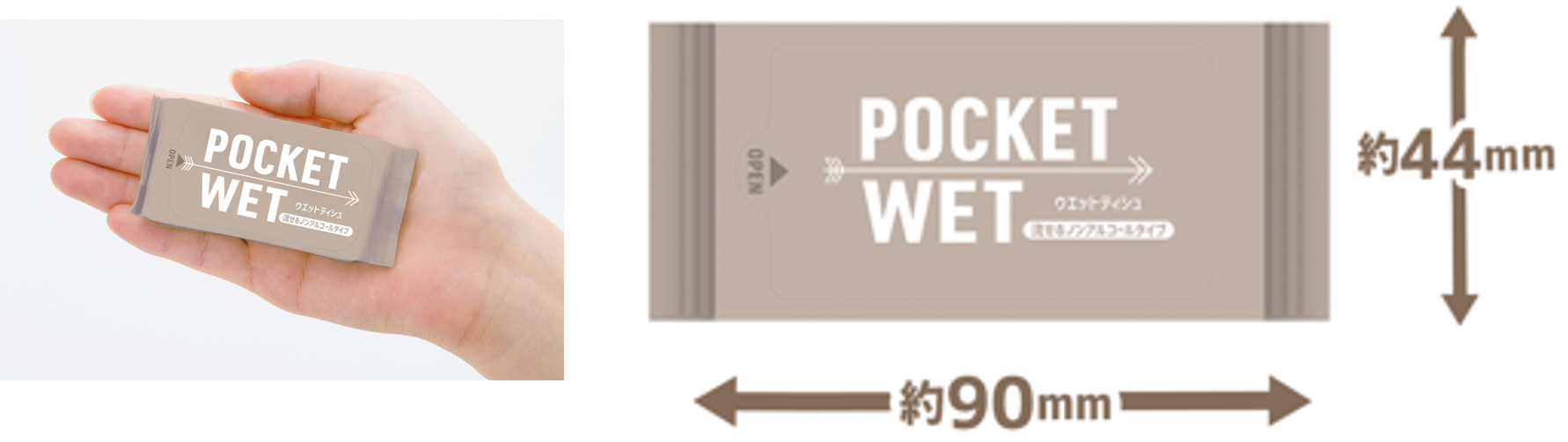 2022年9月に発売となったPOCKET WET。発売当初より、サイズや容量など使い勝手が良いとご好評をいただき、アルコールタイプ、ノンアルコールタイプの2種類を展開しておりましたが、 この度、水に流せるノンアルコールタイプを開発・リリースすることとなりました。