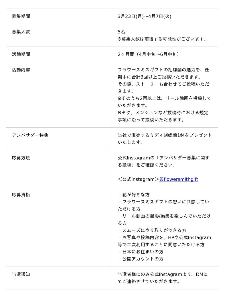 胡蝶蘭専門サイト「フラワースミスギフト」は、この度、ブランド初となる公式アンバサダー制度を開始いたします。
