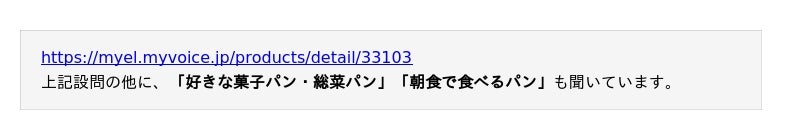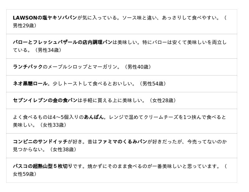 パンの喫食状況や購入場所、自由記述にてお気に入りの市販パンなどについて聞いてます。調査結果をお知らせいたします。