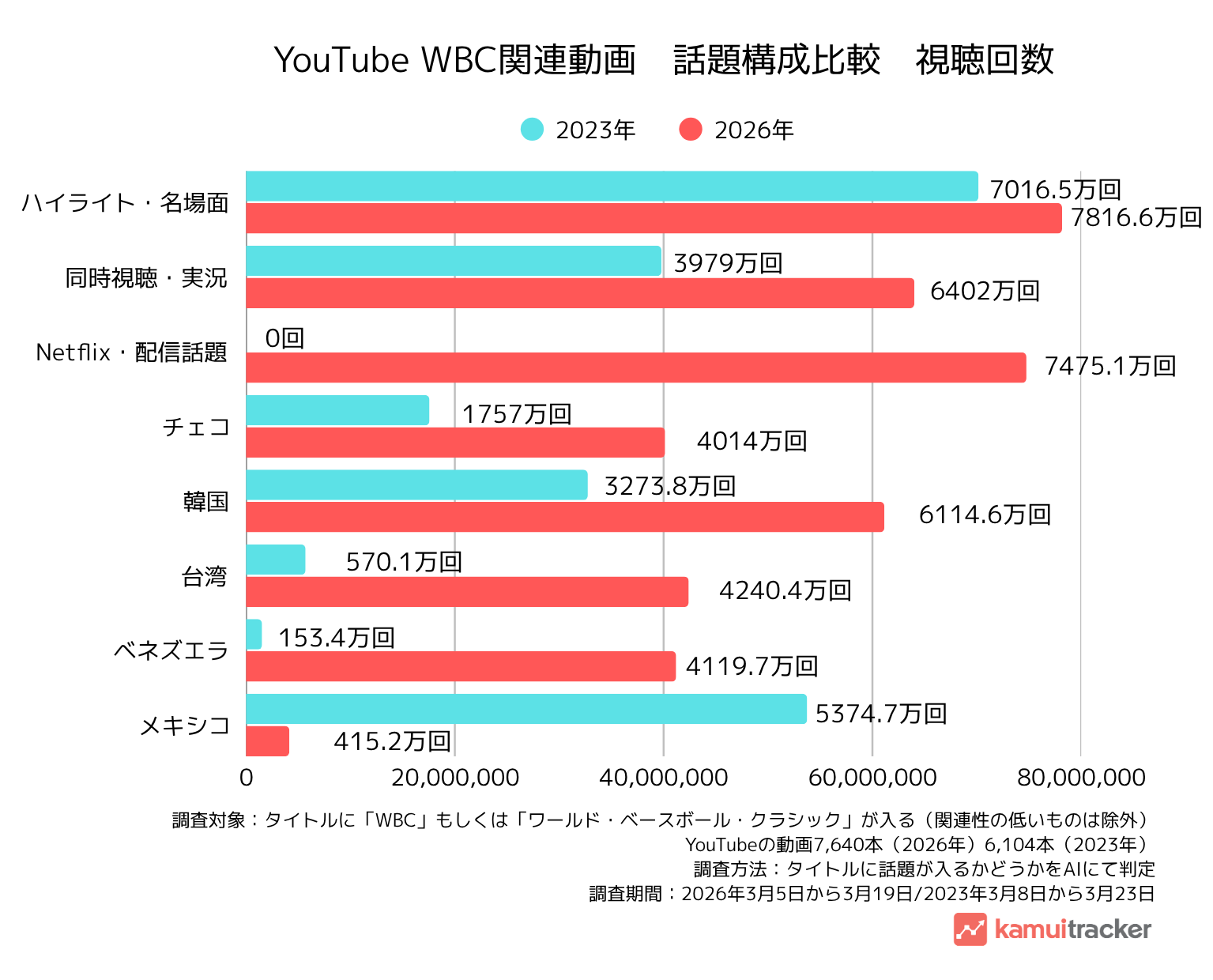 一方、2026年大会では、ハイライトに加えて、同時視聴・実況、Netflix配信をめぐる話題、さらにチェコ代表への好意的反応など、観戦体験そのものが視聴されました。Netfix公式クリエイターの果たした役割も大きいと考えられます。2023年が「名場面を見る大会」だったのに対し、2026年は「観ながら参加し、試合後も語る大会」へと広がったことが特徴です。