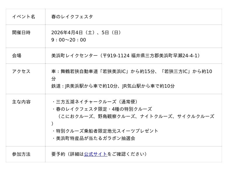 福井県美浜町レイクセンターでは、ラムサール条約登録湿地や日本農業遺産に認定された三方五湖を舞台にした春の特別企画「春のレイクフェスタ2026」を、2026年4月4日(土)・5日(日)の2日間限定で開催します。