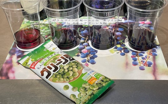 「グリーン豆(春日井製菓提供)」を教材にカジュアルにワインを楽しむペアリングについても体験します。(画像は第2回〈赤ワイン編〉での講座の様子)