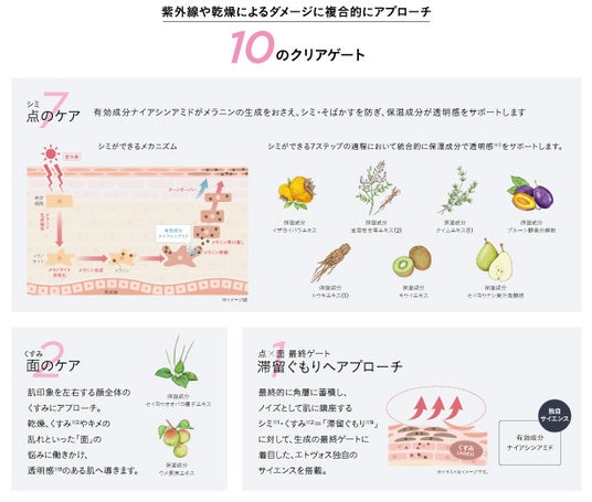 1箇所1成分だけで効かせるのではなく、10のクリアゲート※6を設け、「点」だけではなく「面」にも、ひとつひとつ丁寧にアプローチ。敏感肌でも、シミ※1やくすみ※2の複合的なお手入れが叶います。