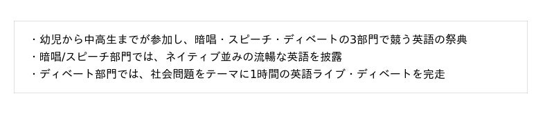 ■ 各部門のハイライト:暗唱部門/スピーチ部門/ディベート部門