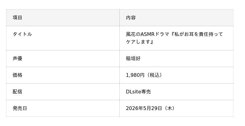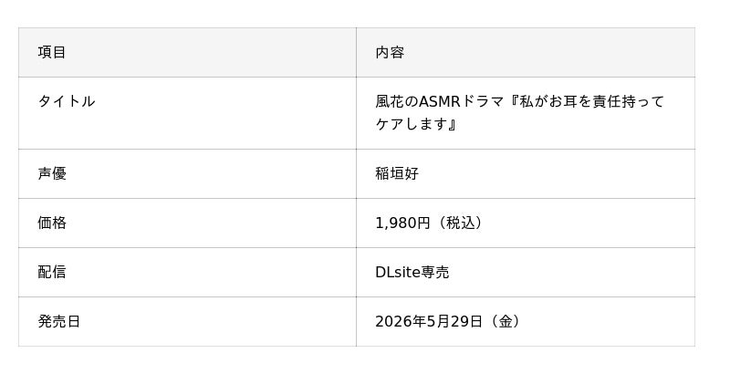 さらに、ゲーム本編と同じ5月29日に、本作のヒロイン・風花(CV:稲垣好)が主役のASMRドラマをDLsiteにて独占配信いたします。今作は風花が忙しいあなたのために、優しく耳ケアをしてくれるオリジナルストーリー。世話好き風花の魅力がたっぷり詰まった60分です。