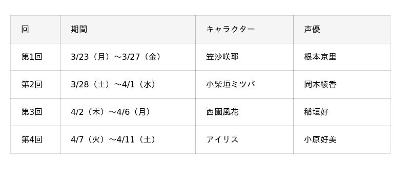 発売日決定を記念して、小原好美 さんをはじめとする豪華声優陣の 直筆サイン色紙 とゲーム本編商品コードが当たるキャンペーンを3月23日17時より開始いたします。5日ごとにキャラクターが入れ替わり、全4サイクルで実施予定です。