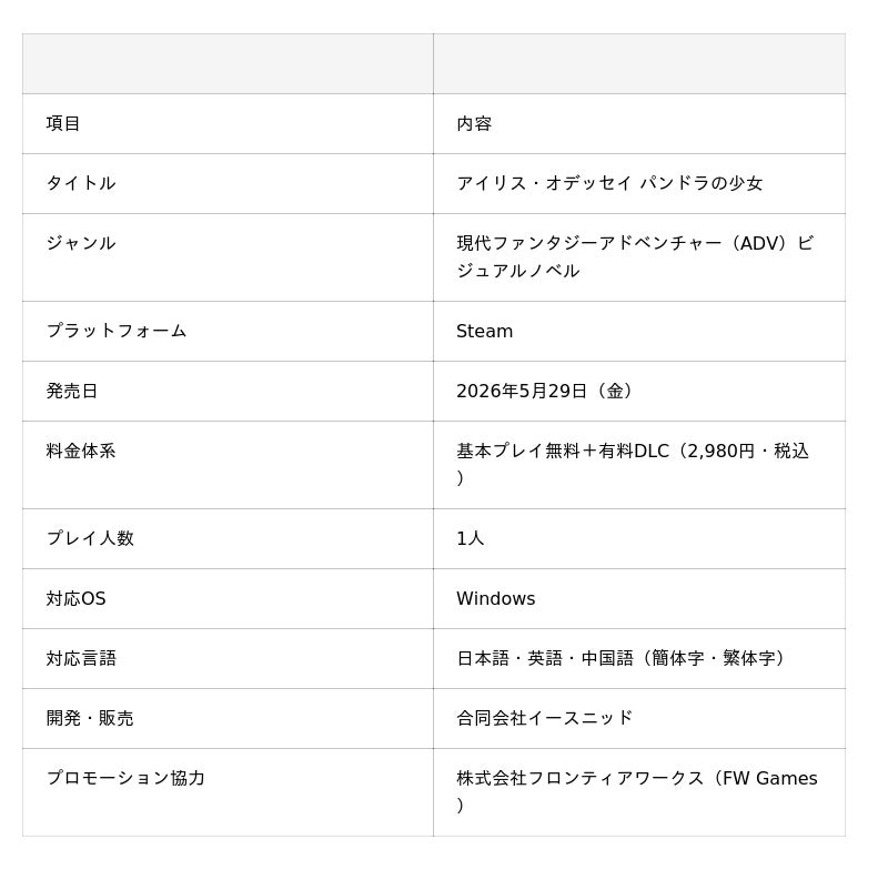 株式会社フロンティアワークスは、自社ゲームブランド「FW Games」にてプロモーション協力を行っております合同会社イースニッド(代表社員:太田一行)がSteamにて開発中の新作フルボイス現代ファンタジーADV 『アイリス・オデッセイ パンドラの少女』 の発売日が 2026年5月29日(金)に決定したことをお知らせいたします。