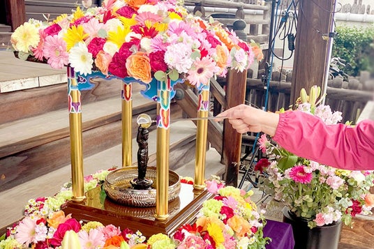 多聞院では「お寺をもっと身近に感じていただきたい」という想いから、一般の方にもご参加いただける体験型イベントとして、伝統行事である「花まつり」を開催しています。「花まつり」とは、お釈迦様の誕生をお祝いする仏教の伝統行事で、花で飾られたお堂のお釈迦様に甘茶をかけて、無病息災や健康を願います。参加者には甘茶も振舞われ、甘い香りとすっきりとした味わいを楽しめます。