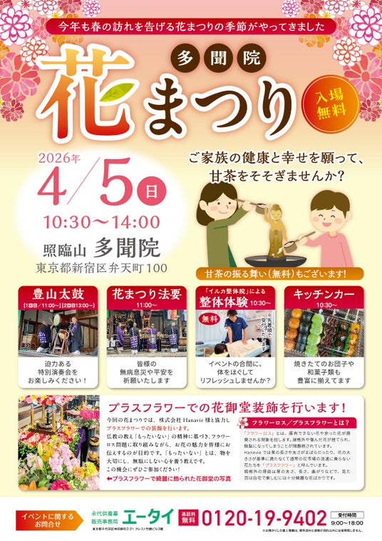 新宿区弁天町の多聞院では、2026年4月5日(日)にお釈迦様の誕生を祝う伝統行事「花まつり」を開催します。昨年に続き、フラワーロス問題解決に貢献する取り組みとして、市場に出回らないお花での装飾で社会問題に向き合います。また、キッチンカーやクイズラリーなどのコンテンツも用意し、お寺を気軽に楽しんでいただけるイベントです。