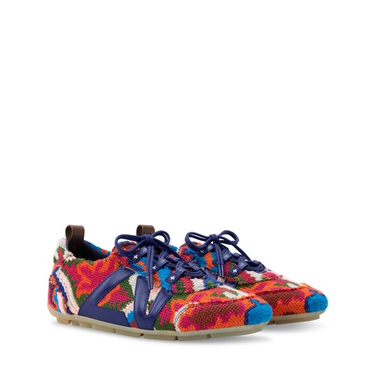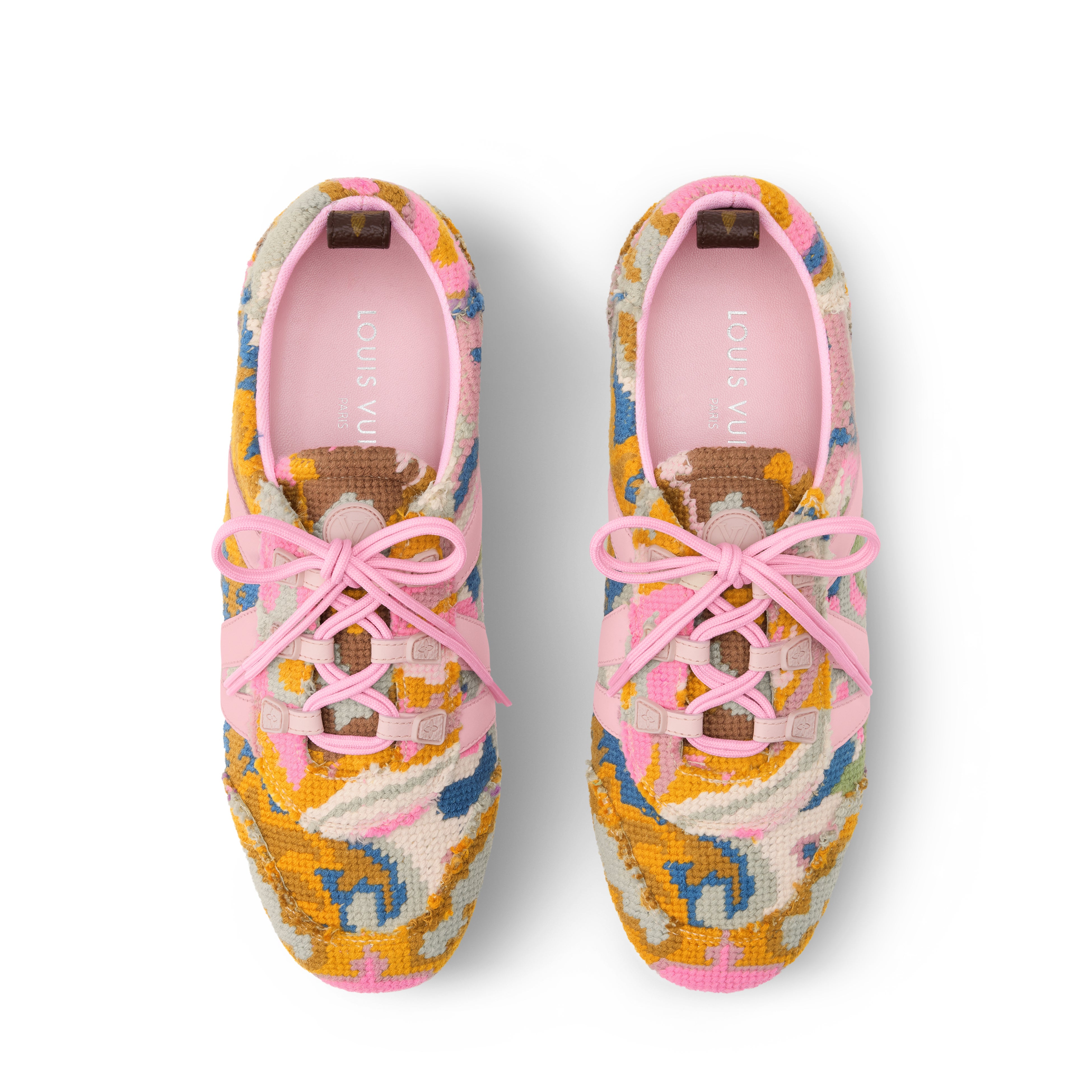 2026春夏ファッションショーに登場した「LV スニーカリーナ」。オリエンタルカーペットと19世紀フランスの刺繍から着想を得たタペストリー素材を使用しました。ヴィンテージ風のフローラル・パターンがメゾンのモノグラム・フラワーを想起させ、サイドにはレザーで模った「LV」をあしらっています。しなやかなラバーアウトソールで仕上げました。