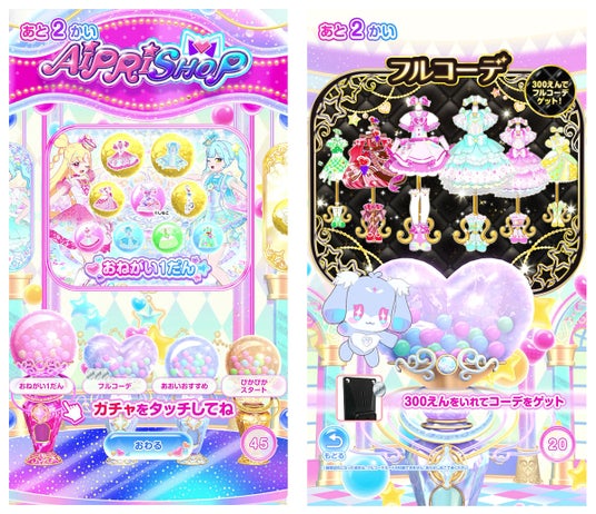 プレイヤーがコーデ(衣装のデータ)を入手できるタイミングも、「おねがい1だん」から大きく変更されます。これまでライブ後に獲得していたコーデが、ライブ前に「コーデガチャ」を回して入手できるようになりました。100円を投入して当たったコーデ2種類のうちどちらかを選ぶと、選んだコーデがプリントされます。入手したコーデはそのあとのライブですぐに使用できるため、初めて『アイプリバース』をプレイするユーザーでも、入手したばかりの自分のコーデアイテムで遊ぶことが可能になり、より一層ライブを楽しめるシステムとなりました。さらに、ライブ後には新たに「フルコーデガチャ」も登場し、画面に表示されるガチャマシンの中にある「フルコーデガチャ」を選択してから300円を投入すると、全部位がすべて揃った「フルコーデ」がプリントされた「フルコーデプリフォト」を入手できるようになります。「フルコーデガチャ」はすべて★4のコーデでラインアップされているため、1回で高いレアリティの「フルコーデ」を楽しめるようになります。