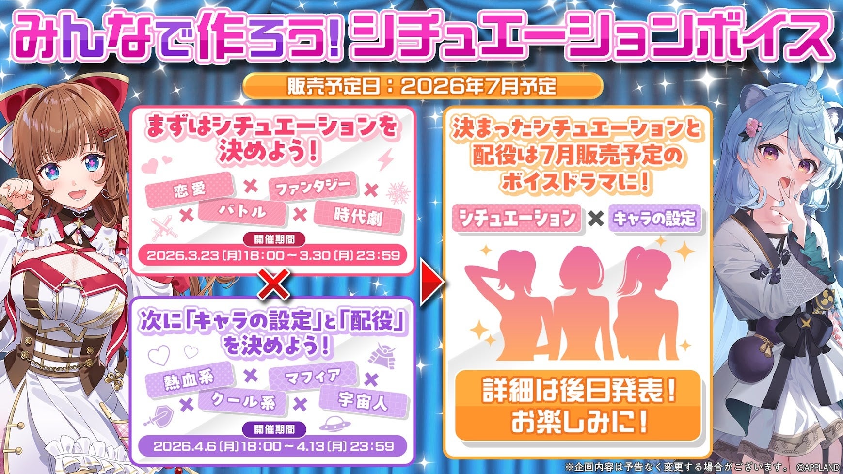 一次投票ではシチュエーションを構成する「ジャンル」と「世界観」を、二次投票では一次投票上位5位のシチュエーションに合わせた「キャラ設定」と「配役」の組み合わせを募集いたします。