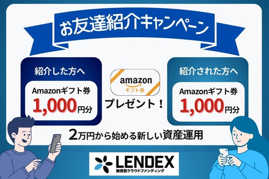 この度、融資型クラウドファンディング「レンデックス(LENDEX)」を運営する株式会社LENDEX(本社:東京都渋谷区、代表取締役:中村 智)は、本日、2026年3月24日(火)より『Amazonギフト券がもらえる!お友達紹介キャンペーン』を実施いたします。