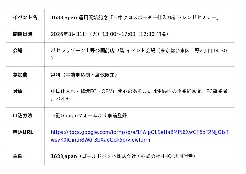 これを記念し、2026年3月31日(火)に東京・上野にて「日中クロスボーダー仕入れ新トレンドセミナー」を無料開催いたします。アリババ1688の代表をはじめ、日中越境ビジネスの第一線で活躍する全7名の専門家が登壇し、仕入れ・物流・マーケティング・EC運営の4領域にわたる実践的なセッションをお届けします。