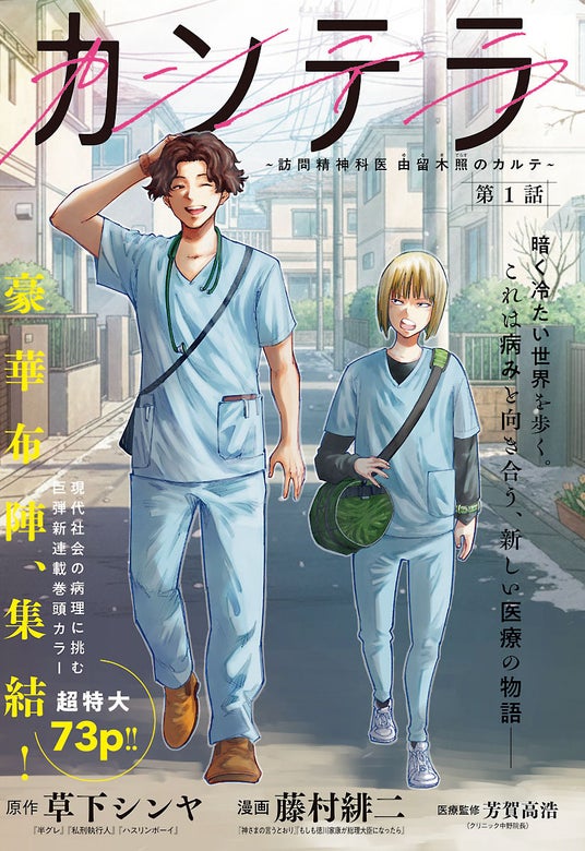 『半グレ―六本木 摩天楼のレクイエム―』、『私刑執行人~殺人弁護士とテミスの天秤~』『ハスリンボーイ』などの原作を手掛ける草下シンヤと、『神さまの言うとおり』『もしも徳川家康が総理大臣になったら-絶東のアルゴナウタイ-』『真の安らぎはこの世になく -シン・仮面ライダー SHOCKER SIDE-』などの漫画を担当した藤村緋二の新連載、『カンテラ~訪問精神科医 由留木照のカルテ~』が3月24日(火)から『ヤングチャンピオン』にて連載開始。