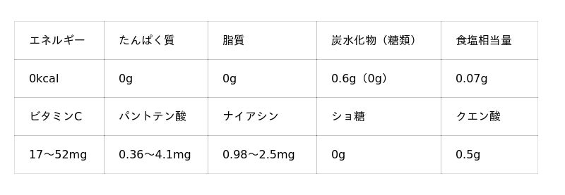 ■原材料名:レモン果汁(レモン(輸入))、食塩/香料、酸味料、クエン酸K、ビタミンC、甘味料(アセスルファムK、スクラロース)、パントテン酸Ca、ナイアシン、マリーゴールド色素