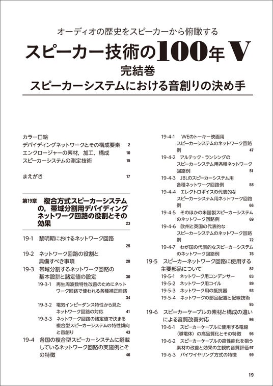 19章のデバイディングネットワークでは、内外スピーカーシステムの回路を詳細に紹介し、また使用する素子についても言及しています。