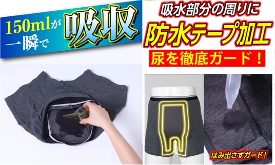 吸水量は最大150ml※1。急な強い尿意で思わず漏れてしまった場合でも、しっかり受け止められる設計です。さらに、吸水部分の周囲に防水テープ加工を施すことで、尿がはみ出しにくい構造に。