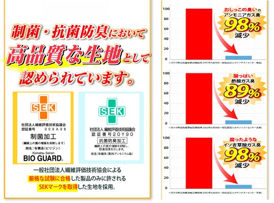 制菌・抗菌として厳格な試験に合格した「SEKマーク取得生地」を採用し、消臭・制菌加工を実現。試験データとして、アンモニア臭99%減少(アンモニアガス98%減少/酢酸ガス臭89%減少/イソ吉草酸ガス臭98%減少)の数値を示しています。