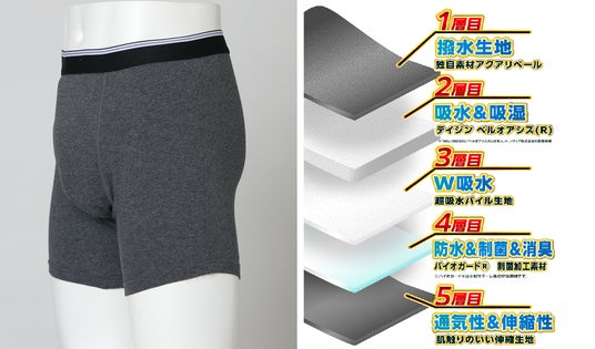 撥水生地/吸水・吸湿素材/W吸水パイル/防水・制菌・消臭素材/通気・伸縮生地の「独自5層構造」を採用。