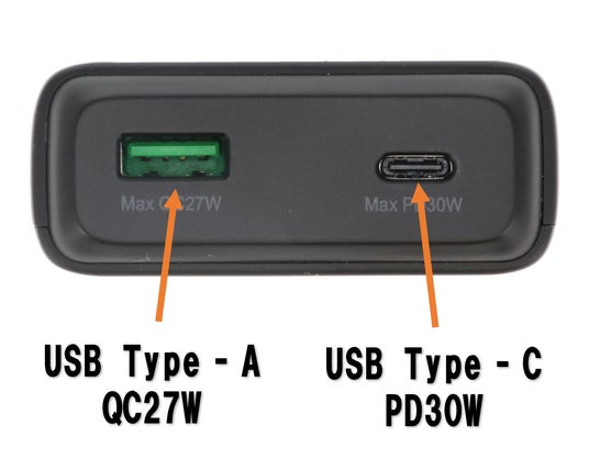 さらに、PD(※2)最大30W、QC(※3)最大27Wの急速充電に対応しており、スマートフォンなどを効率よく充電できます。また、モバイルバッテリー本体への入力もPD30Wに対応しているため、短時間で本体を充電することができます。