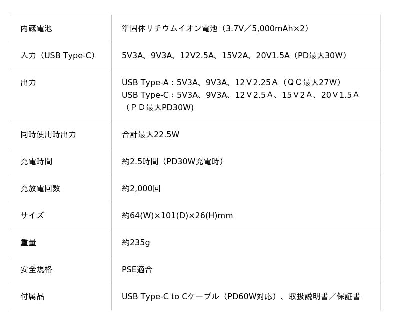 PD30W対応 準固体モバイルバッテリー(10000mAh)