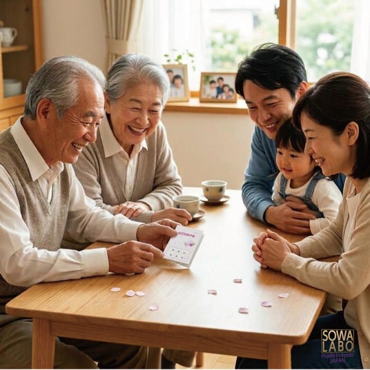 (おじいさんがこれから始めるパノラマ血圧記録帳を家族で笑顔の応援。画像はAIで生成したイメージ写真です)