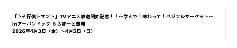 本イベントでは、豊洲市場直送の旬野菜・フルーツが並ぶマルシェをはじめ、親子で参加できるワークショップ、館内回遊型ラリー、キャラクターグリーティング、さらにアニメ声優によるトークショーなど、「うそ探偵トマント」の世界観を“学んで・味わって・楽しめる”コンテンツを展開します。