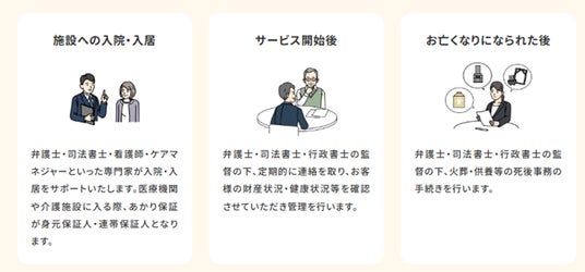 具体的には、身元保証、病院・施設の入居のサポート、具体的には、ご家族の代わりに入院・入居時に保証人になったりするだけでなく、ご家族の代わりに定期的に連絡をとり、健康状況等の確認、