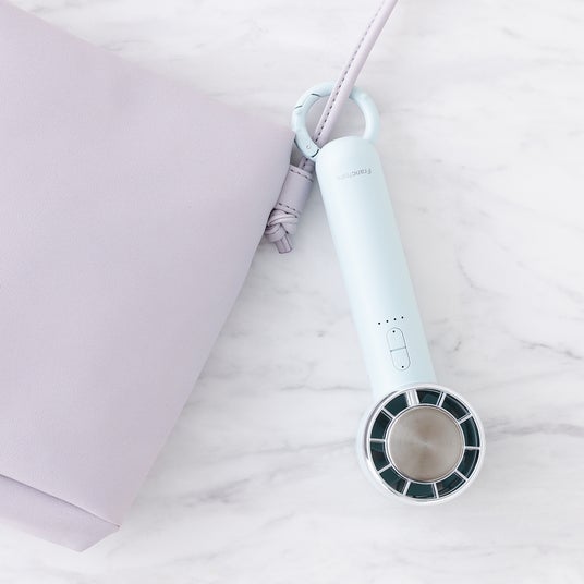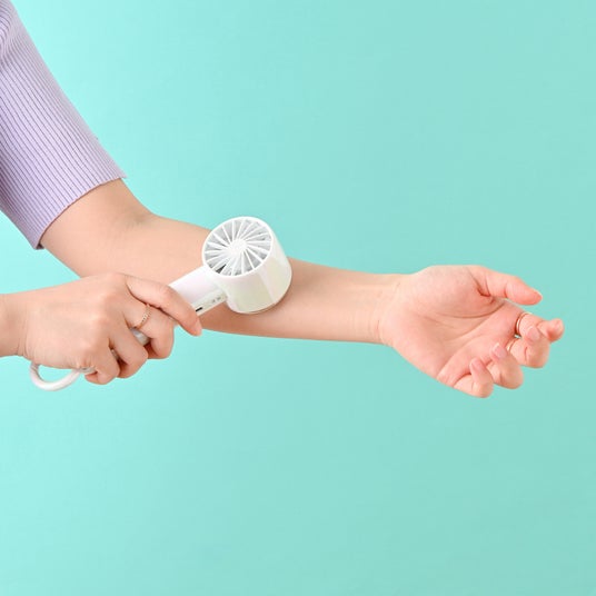 身体を直接冷やすことができる冷却プレートを搭載したハンディファンです。火照った顔や身体に冷却プレートを当てることで、効率よくひんやりクールダウンできるため、猛暑日のお出かけやフェス、スポーツ観戦、運動後などの屋外シーンで特に活躍します。冷感とパワフルな風量でひんやり涼しく、夏の猛暑日にも活躍するのが魅力。冷却モードと通常モードの2ボタン仕様で簡単に操作でき、使いやすさ(運動音:53.5dB~63.1dB程度※当社調べ)も兼ね備えた設計。また、充電残量を確認できる機能を備えているのも嬉しいポイントです。デザインは、シンプルでどんなファッションにも合わせやすいホワイトとミント、シアーなミルキーカラーにマーブル模様が涼しげなピンクとイエロー、きらきらと輝くオーロラデザインが魅力のホワイトとパープルの全6色をラインアップ。軽量でコンパクトなフォルムで持ち運びやすく、付属のストラップを取り付ければ、持ち歩きにぴったり。カラビナを使ってバッグに直接取り付けられるほか、カラビナ部分を折り曲げれば、デスクや洗面所、キッチンなど卓上でも使用できます。