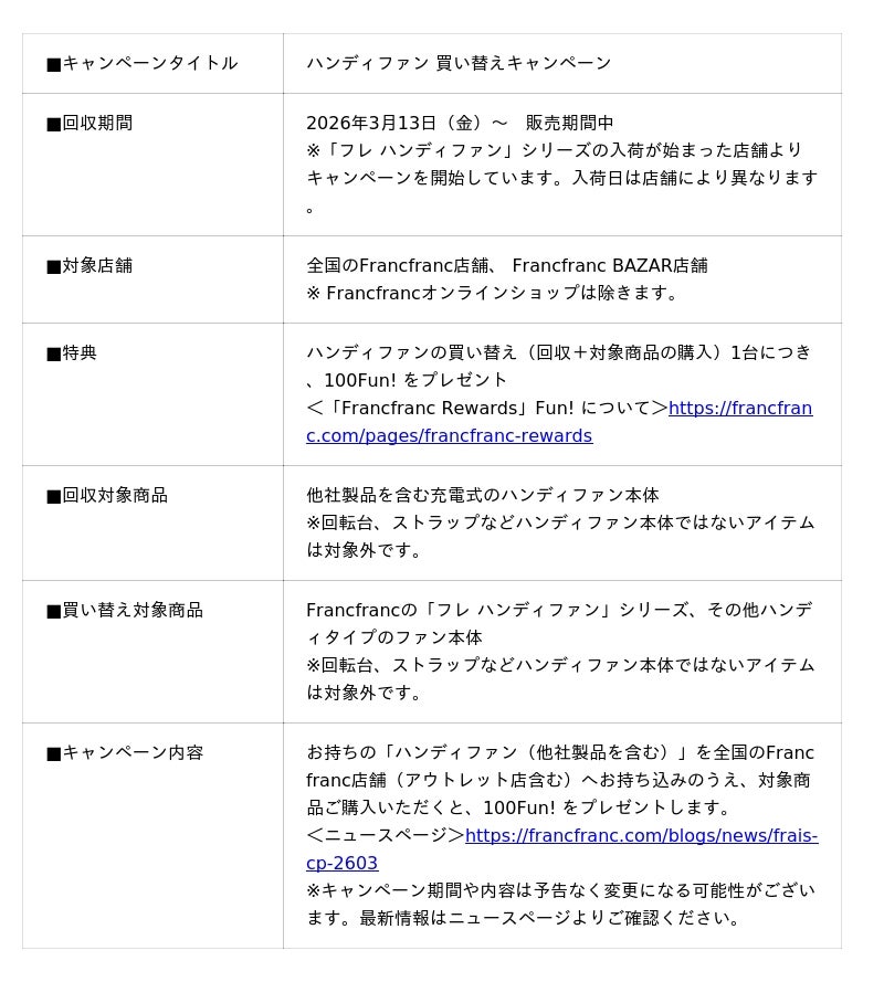 Francfrancはライフスタイルを提案するブランドとして、2018年から夏の暑さ対策に涼しさを持ち運ぶことができる「フレ ハンディファン」シリーズを販売し、快適さとファッション性を兼ね備えたアイテムとして、時のトレンドを取り入れながら進化してきました。これまで「買い替えたいが捨て方が分からない」というお客様の声にお応えすることを目的に、「ハンディファン買い替えキャンペーン」を実施してきました。お客様からの「来年もやって欲しい!」といったお声や、ファッションのようにトレンドを取り入れて楽しんでいただきたいという想いから、今年もすべての充電式ハンディファンを対象に、全国のFrancfranc店舗にて「ハンディファン 買い替えキャンペーン」を3月13日(金)より実施しています。今年は、「フレ ハンディファン」シリーズの販売期間中、不要な充電式ハンディファンを店舗へお持ち込みのうえ、対象のハンディファンをご購入いただいたお客様に、会員制度「Francfranc Rewards」の100Fun! をプレゼントします。2026年の「フレ ハンディファン」シリーズは、ぷっくり&うるうるの質感やクリアの輝き、ニュアンス感のあるウェービーなディテールなど、日差しを味方にしてキラキラ輝く、特別な夏の瞬間にぴったりな新デザインもラインアップしています。 この機会にぜひ、最新トレンドを取り入れた「フレ ハンディファン」シリーズとともにきらめく夏をお楽しみください。