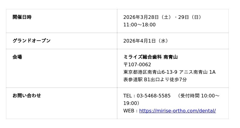 株式会社MEDiDENT/ミライズウェルメディカルグループ(東京都港区南青山、代表取締役:富田大介)は、2026年4月1日(水)、「ミライズ総合歯科 南青山」(MIRISE ADVANCED DENTAL CLINIC MINAMI AOYAMA)をグランドオープンいたします。本クリニックは、表参道エリアに位置し、一般歯科・小児歯科・口腔外科・矯正歯科・補綴治療・インプラント・審美治療など、すべての診療部門に専門家が在籍するワンストップ型の次世代総合歯科クリニックです。