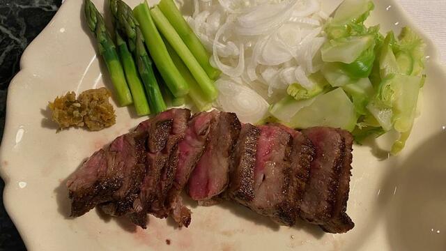 牛肩ロースステーキ(アスパラガス、新玉ねぎ、茹でた春蕾。柚子胡椒で食べる)。