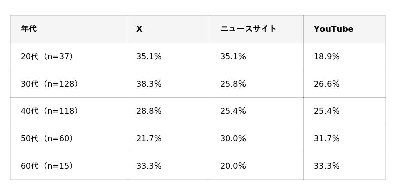 また、回答者数の多い30代・40代に絞ってみると、30代ではXが38.3%で最多となり、YouTube(26.6%)、ニュースサイト(25.8%)を上回りました。40代でもXは28.8%で最多となり、YouTube(25.4%)、ニュースサイト(25.4%)を上回りました。