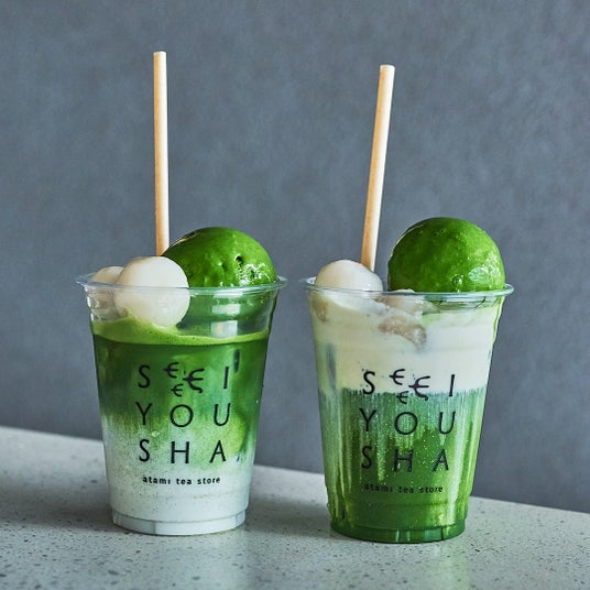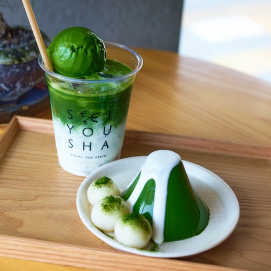 富士山の麓で育った茶葉からできた質のよい抹茶『富士抹茶』を使用したドリンクやデザートがいただける「熱海青葉舎」。お客さんの前で抹茶を点ててくれるので、本格的なお抹茶を目でも舌でも楽しむことができます。中でもおすすめは、塩抹茶ラテ。旨みのある富士抹茶と濃厚な塩クリームがマッチした一品で、イートインでもテイクアウトでもOK。富士プリン、富士抹茶クッキーもぜひ。