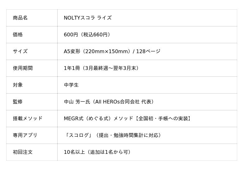 株式会社 NOLTY プランナーズ(本社:東京都中央区、代表取締役社長:細野 肇、以下 当社)は、中学生が高校受験に必要となるポートフォリオ(活動報告書)を“書く・振り返る”の繰り返しで自然に蓄積できる手帳『NOLTYスコラ ライズ(以下ライズ)』を 2025 年 3 月下旬より全国発売いたします。ライズは、非認知能力育成研究の第一人者である中山 芳一氏(All HEROs 合同会社代表 元岡山大学 教育推進機構 准教授)の監修のもと、全国で初めてMEGR式(めぐる式)メソッドを搭載し、中学生の自己成長と高校受験対策を強力にサポートします。